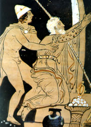 Chopping his child into segments, then boiled in the stew, he attemped to fool the gods at his macabre dinner party. Most of the gods caught on and refused the entree. Demeter, stressed from being worried about Persephone, who had been kidnapped, ended up eating a small peice of Pelops' shoulder. oops.